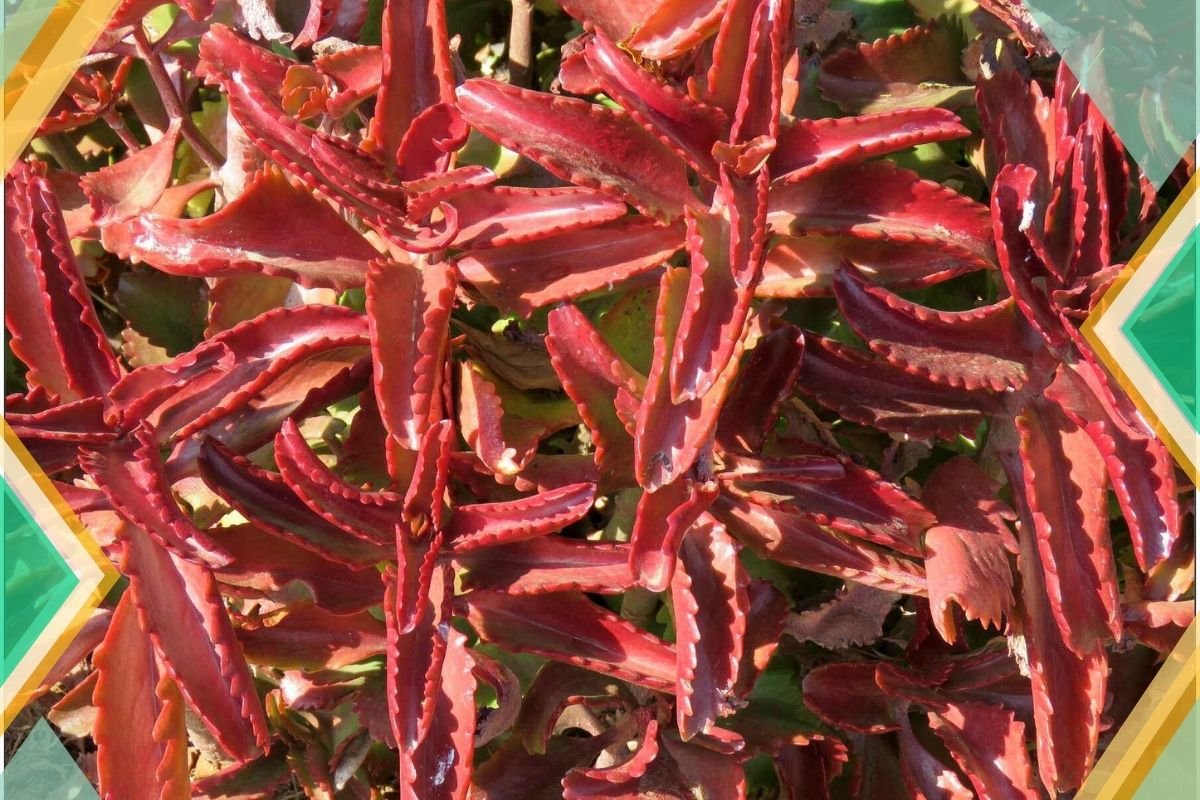Kalanchoe sexangularis has green leaves with a red shade. If you put it in sunlight place its leaves will turn red overall. In addition, the green leaves will turn red in winter too.